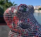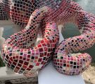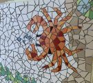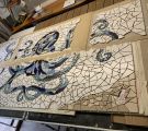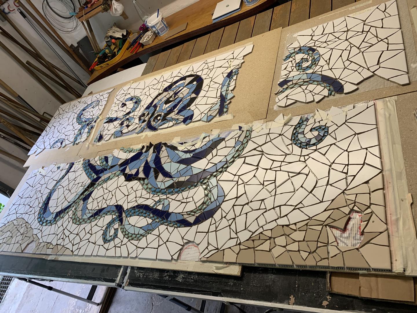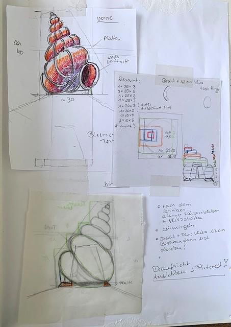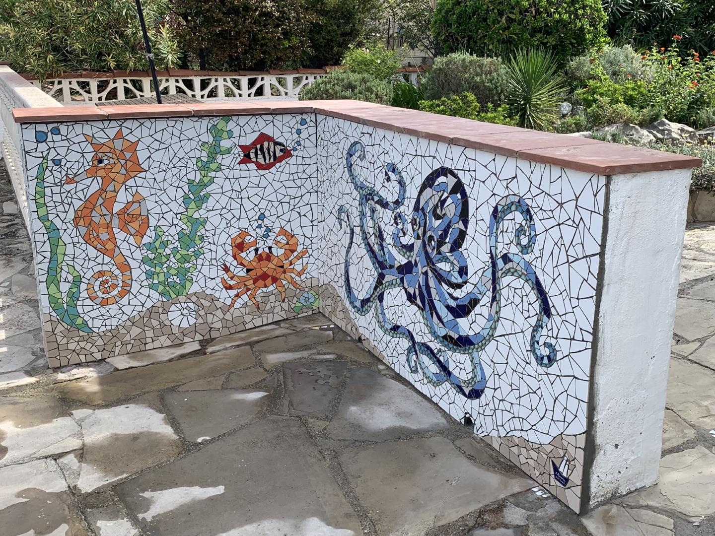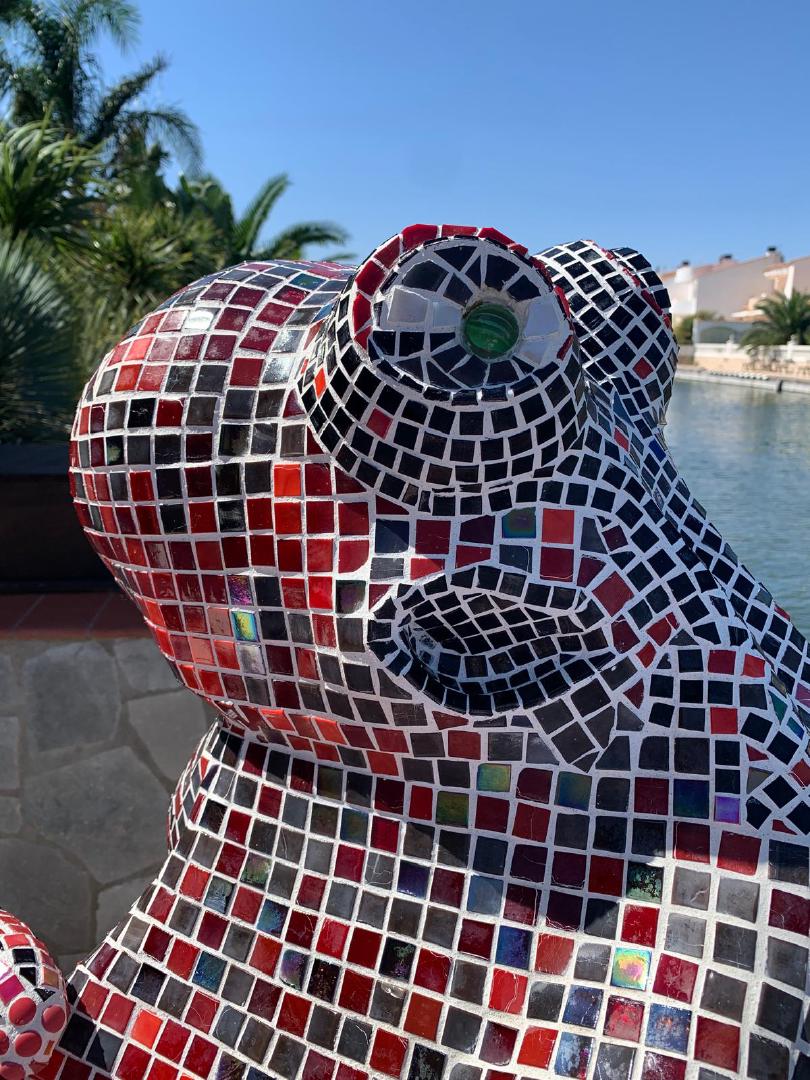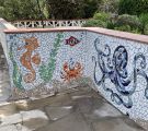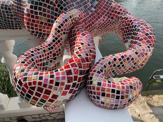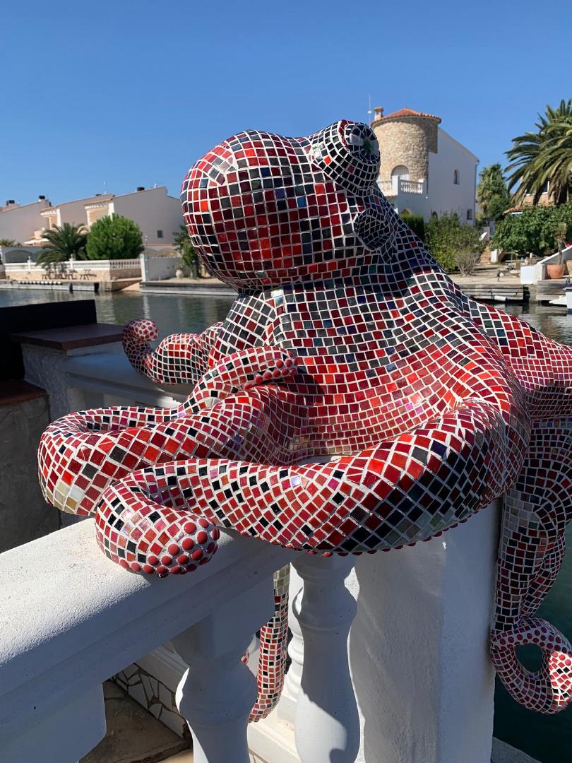 Von 2D zu 3D, mit ‚mar‘ entdeckte ich mein Interesse für Kraken und so wollte ich direkt neben dem Wandmosaik auf dem Mauerpfosten einen Pulpo aus Mosaik bauen. Der Platz war ideal, die Arme konnten baumeln, sich um den Pfosten schlängeln und er schaute den ganzen Tag aufs Wasser. So die Idee, es wurde gemessen, eine Skizze gezeichnet, überlegt, wie ich es konstruieren müsste, denn es musste schließlich dem Wind und Wetter standhalten. Die Skulptur war gebaut ein rundlicher Kopf mit acht Armen ineinander verschlungen, komplizierter hätte ich es auch nicht machen können, aber er sollte naturgetreu werden. Eines hatte ich jedoch nicht bedacht - meine Mosaiksteinchen sind viereckig, auf runden Körperteilen? Es hat eine Weile gedauert, bis ich wortwörtlich den Dreh raushatte und er ist natürlich wieder größer geworden als ursprünglich geplant.