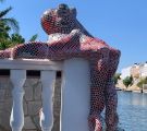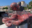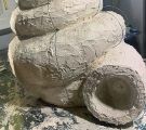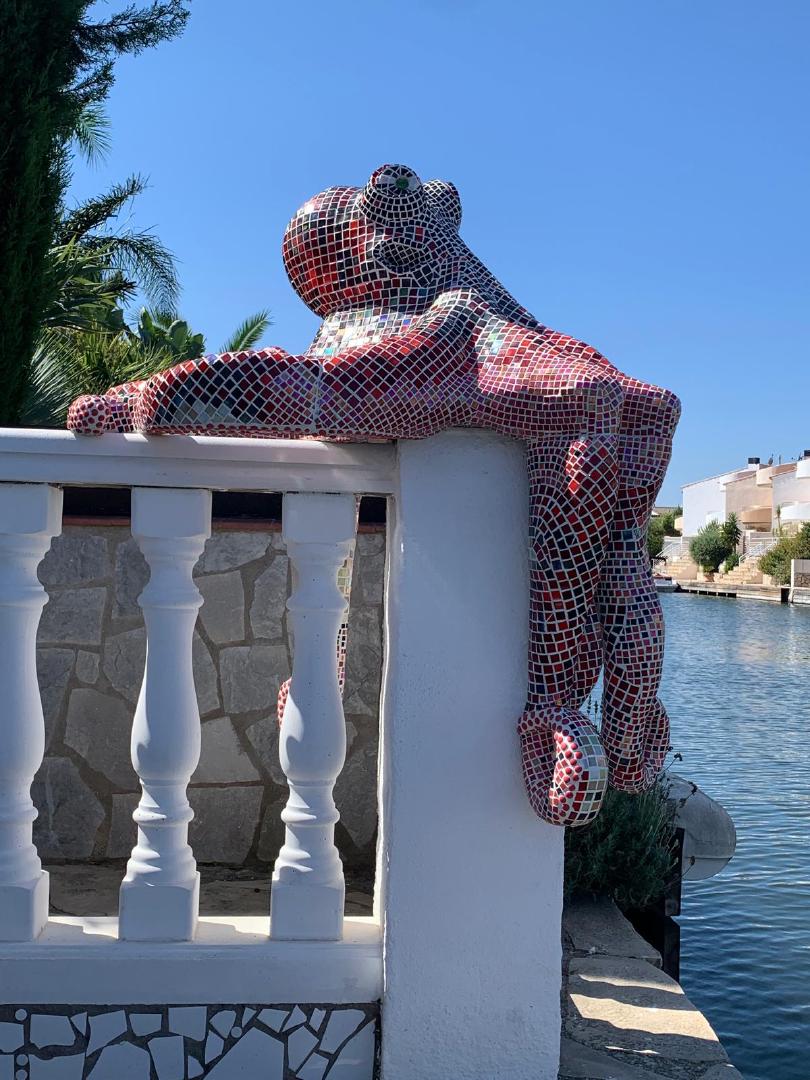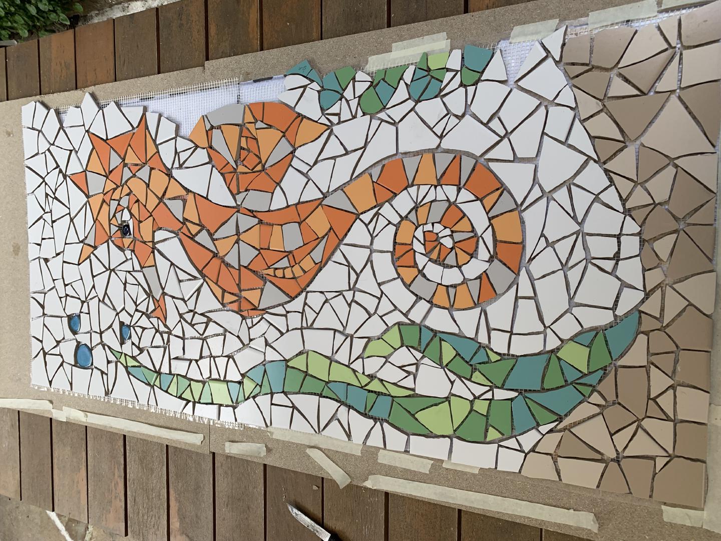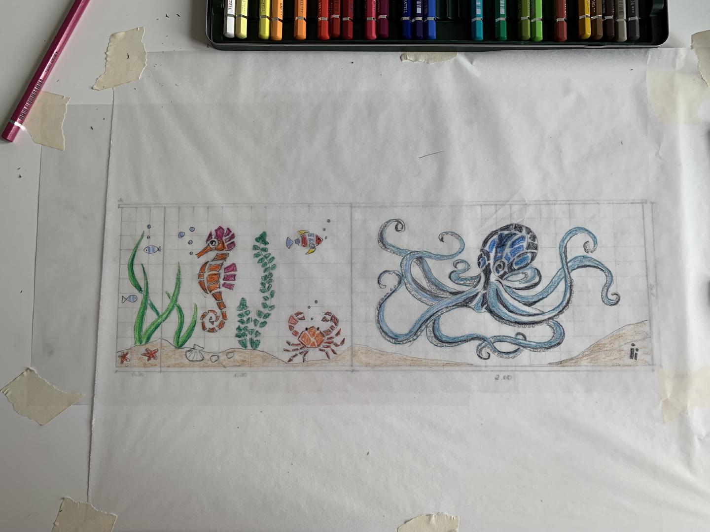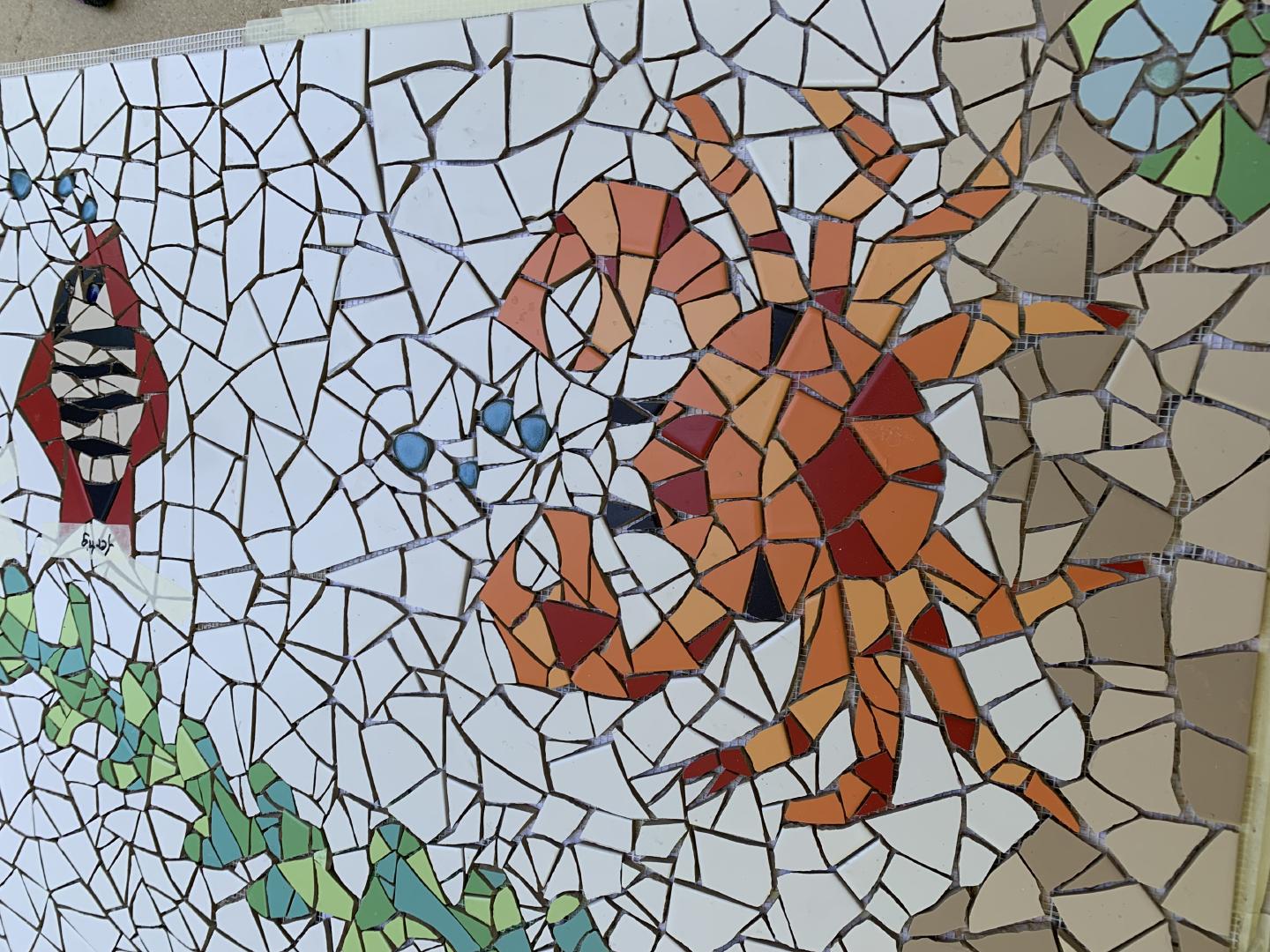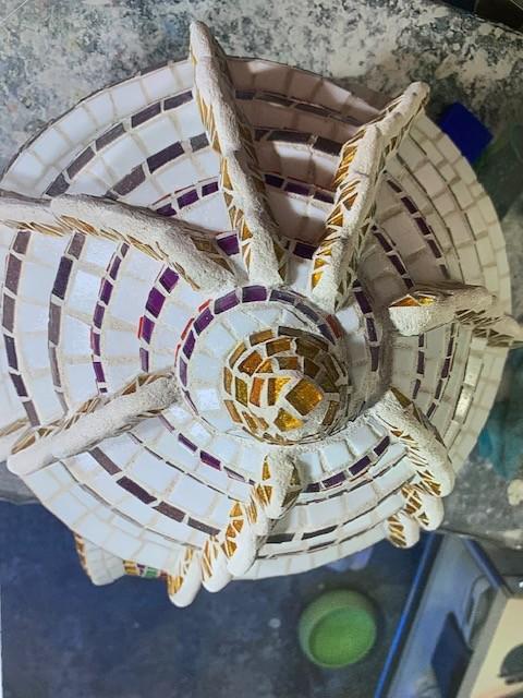 Von 2D zu 3D, mit ‚mar‘ entdeckte ich mein Interesse für Kraken und so wollte ich direkt neben dem Wandmosaik auf dem Mauerpfosten einen Pulpo aus Mosaik bauen. Der Platz war ideal, die Arme konnten baumeln, sich um den Pfosten schlängeln und er schaute den ganzen Tag aufs Wasser. So die Idee, es wurde gemessen, eine Skizze gezeichnet, überlegt, wie ich es konstruieren müsste, denn es musste schließlich dem Wind und Wetter standhalten. Die Skulptur war gebaut ein rundlicher Kopf mit acht Armen ineinander verschlungen, komplizierter hätte ich es auch nicht machen können, aber er sollte naturgetreu werden. Eines hatte ich jedoch nicht bedacht - meine Mosaiksteinchen sind viereckig, auf runden Körperteilen? Es hat eine Weile gedauert, bis ich wortwörtlich den Dreh raushatte und er ist natürlich wieder größer geworden als ursprünglich geplant.