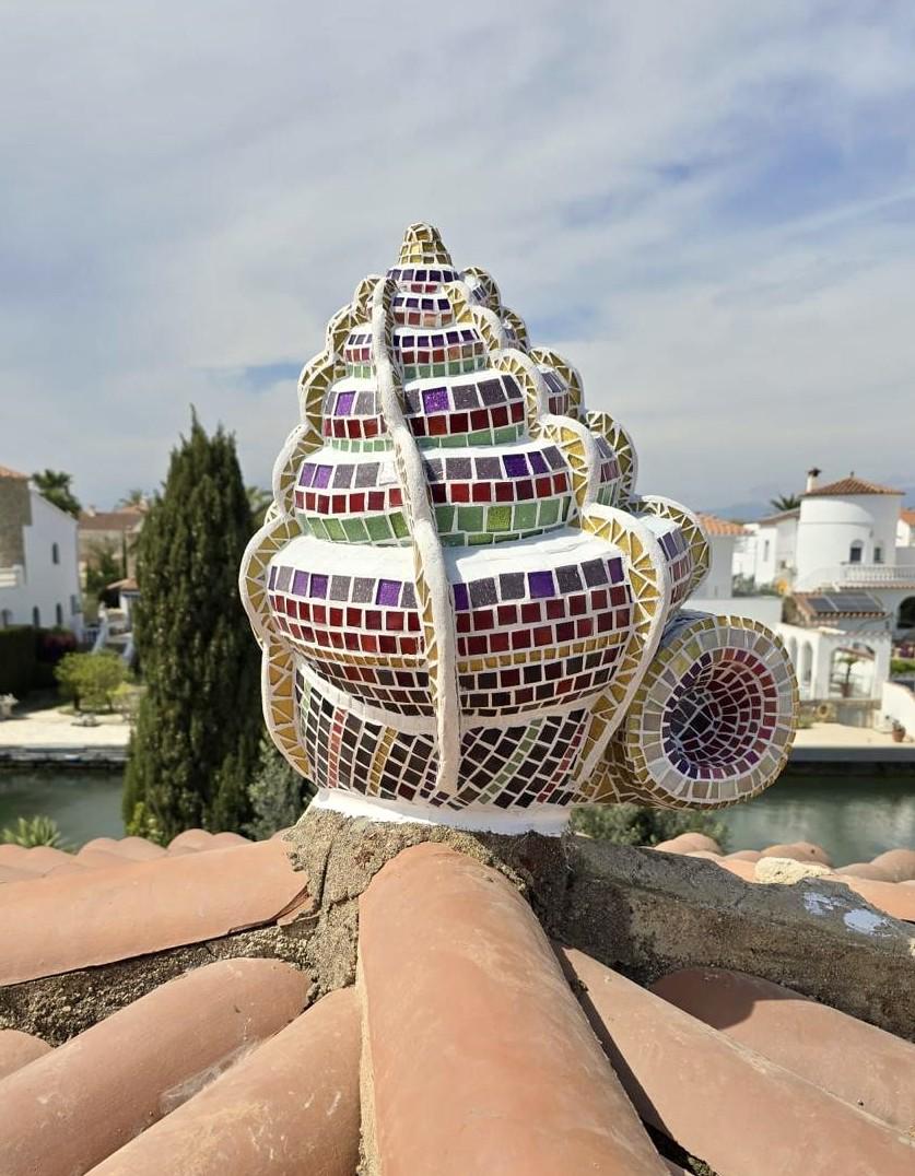 Auf meinem Dach fehlte schon seit Jahren der traditionelle Pinienzapfen aus Terrakotta, er war irgendwann dem Sturm zum Opfer gefallen. Warum eigentlich wieder einen Pinienzapfen kaufen? Die Form eines Schneckenhauses würde ideal passen. Carcol del mar ist spanisch und heißt übersetzt Meeresschnecke. In der Natur sind sie bunt, schillernd und mit wunderschönen Gehäusen zu finden. Jetzt thront sie dort oben bunt und schillernd mit goldfarbenen Steinen im Sonnenlicht und bislang trotzt sie dem Wetter.